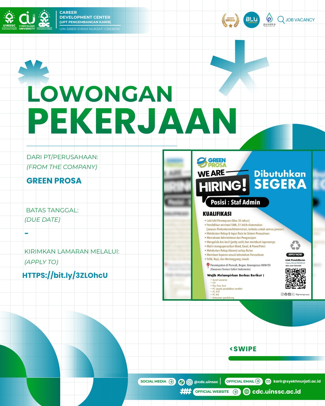 Bagi kamu yang teliti, detail-oriented, dan terbiasa dengan administrasi serta pengolahan data, ini peluang yang tepat untuk mengembangkan kariermu. Kini Green Prosa sedang membuka lowongan bagi kamu yang siap terjun langsung dalam dunia kerja.