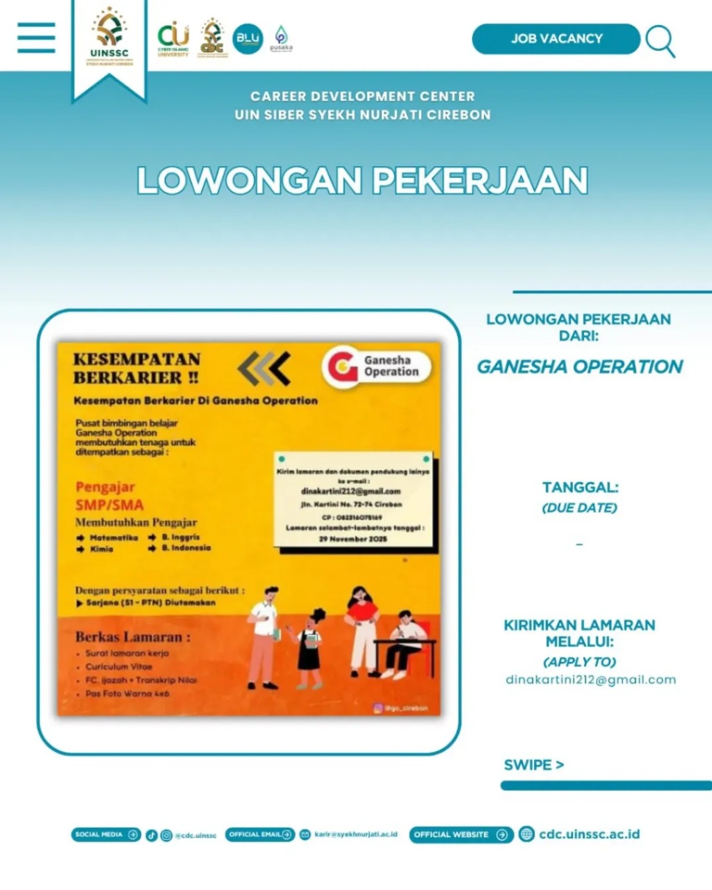 #CDCUINSSC #UINSiberSyekhNurjati #LowonganKerja #LokerCirebon #GaneshaOperation #GOIndonesia #KarierPendidikan #LowonganGuru #Bimbel
