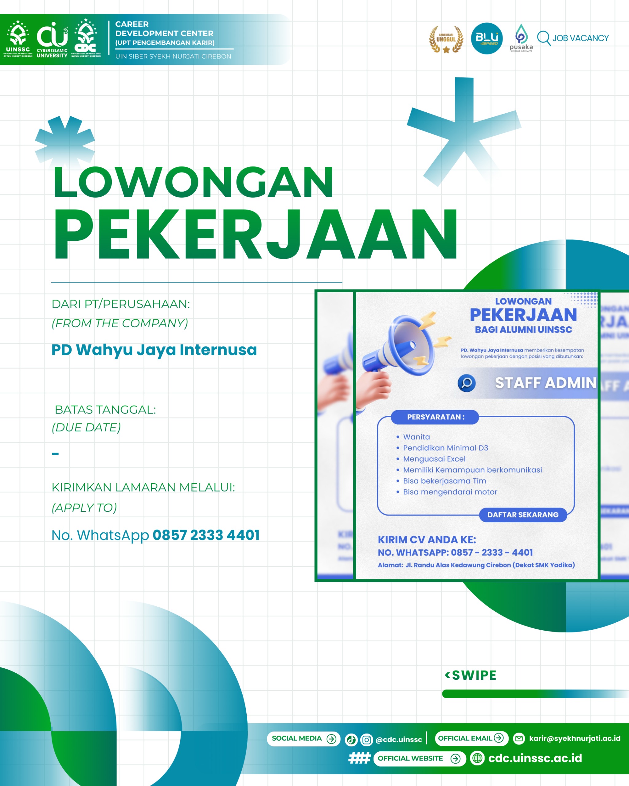 10 Mar PD. Wahyu Jaya Internusa membuka lowongan pekerjaan sebagai Staff Admin by muhamad qusaeri [CAREER DEVELOPMENT CENTERUIN SIBER SYEKH NURJATI CIREBON] We Are Hiring