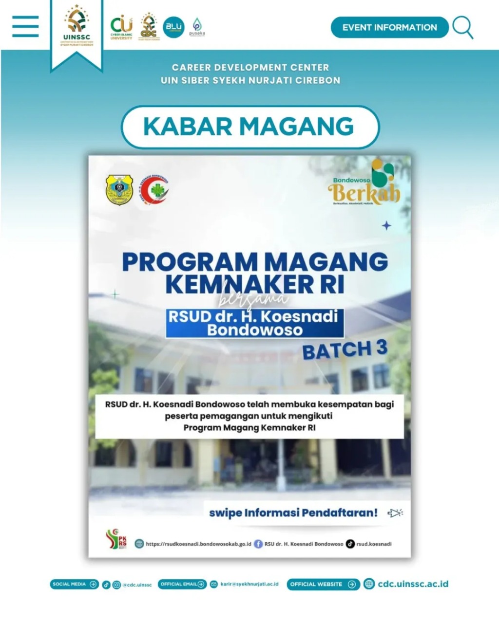 UPT Pengembangan Karir (Career Development Center) UIN Siber Syekh Nurjati Cirebon menginformasikan bahwa Program Magang resmi dari Kementerian Ketenagakerjaan Republik Indonesia bekerja sama dengan RSUD dr. H. Koesnadi Bondowoso Batch 3 kini telah dibuka untuk pendaftaran.