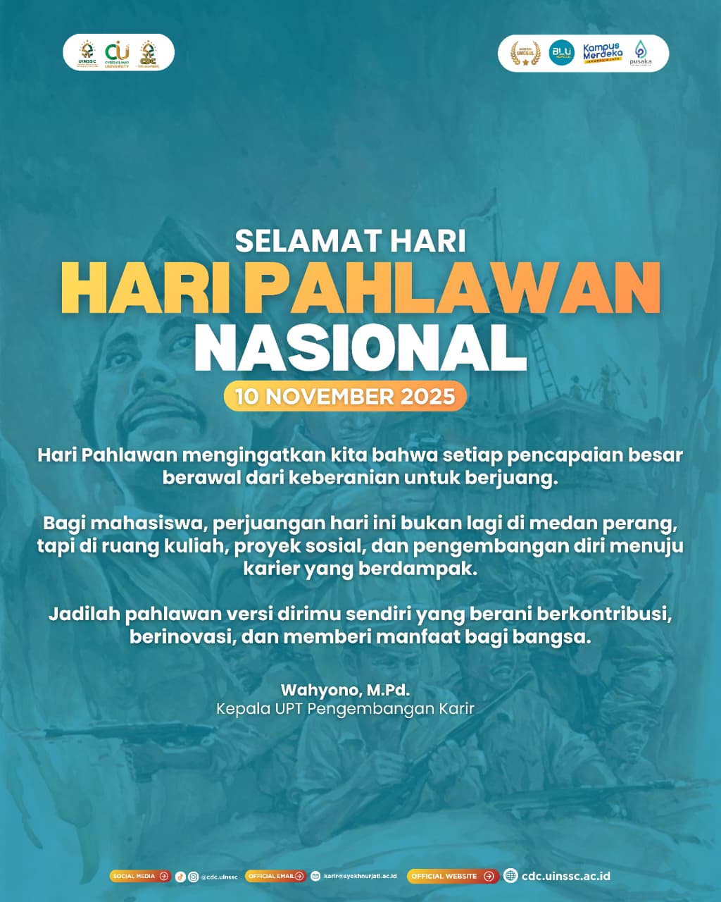 Melalui momentum Hari Pahlawan ini, UPT Pengembangan Karir UIN Siber Syekh Nurjati Cirebon mengajak seluruh sivitas akademika untuk terus mengembangkan potensi diri, memperkuat semangat kolaborasi, serta berkontribusi dalam membangun bangsa melalui bidang keilmuan dan profesi masing-masing.