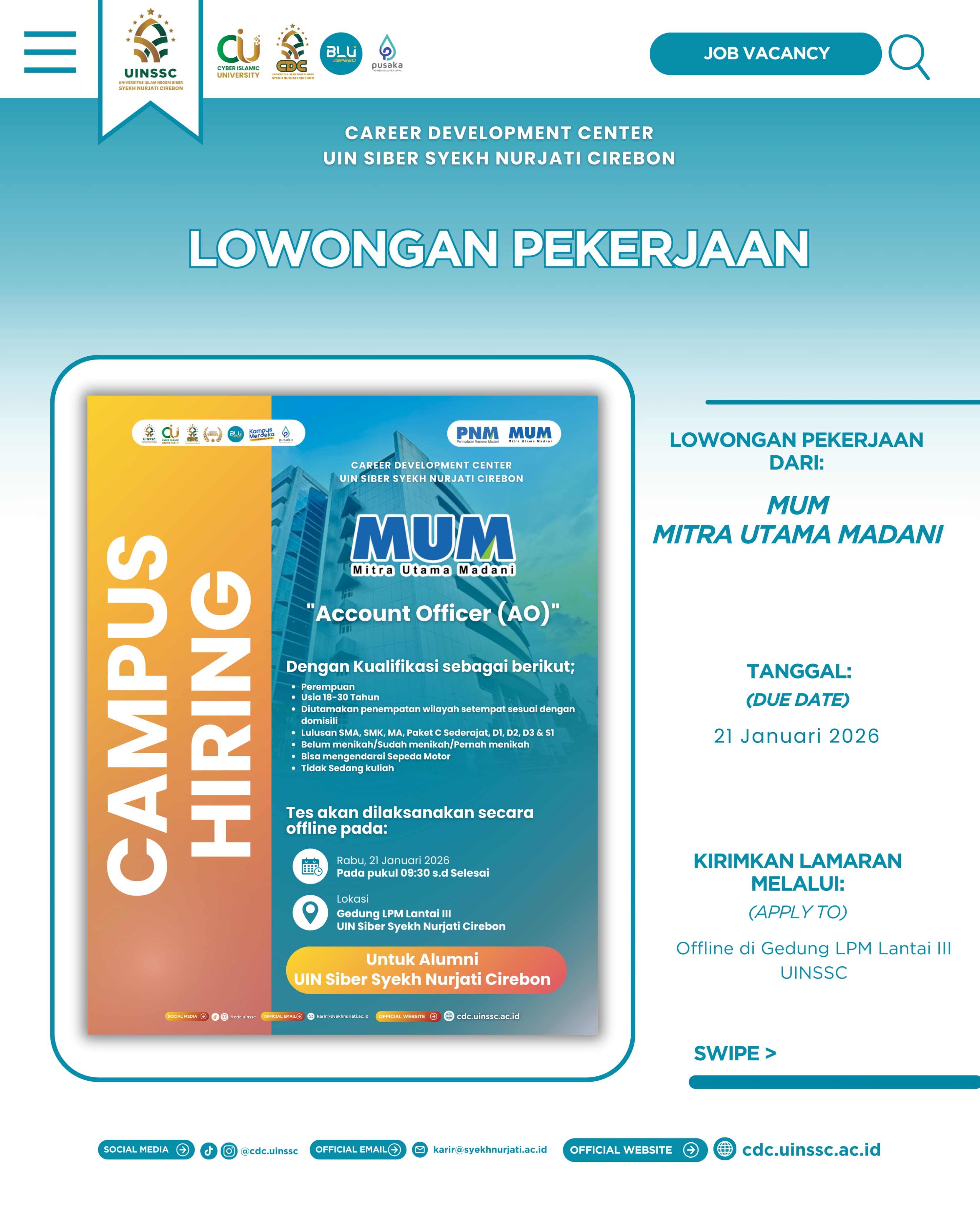 Kesempatan emas untuk kamu para Alumni UIN Siber Syekh Nurjati Cirebon! MUM Mitra Utama Madani membuka kesempatan untuk memulai karirmu sekarang juga!