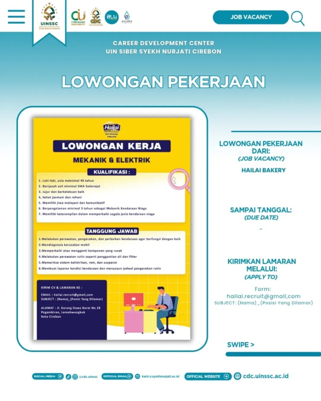 #UINSSC #CDCUINSSC #LowonganKerja #LokerCirebon #HailaiBakery #Karir #Mekanik #Elektrik #LokerTerbaru #KarirCirebon