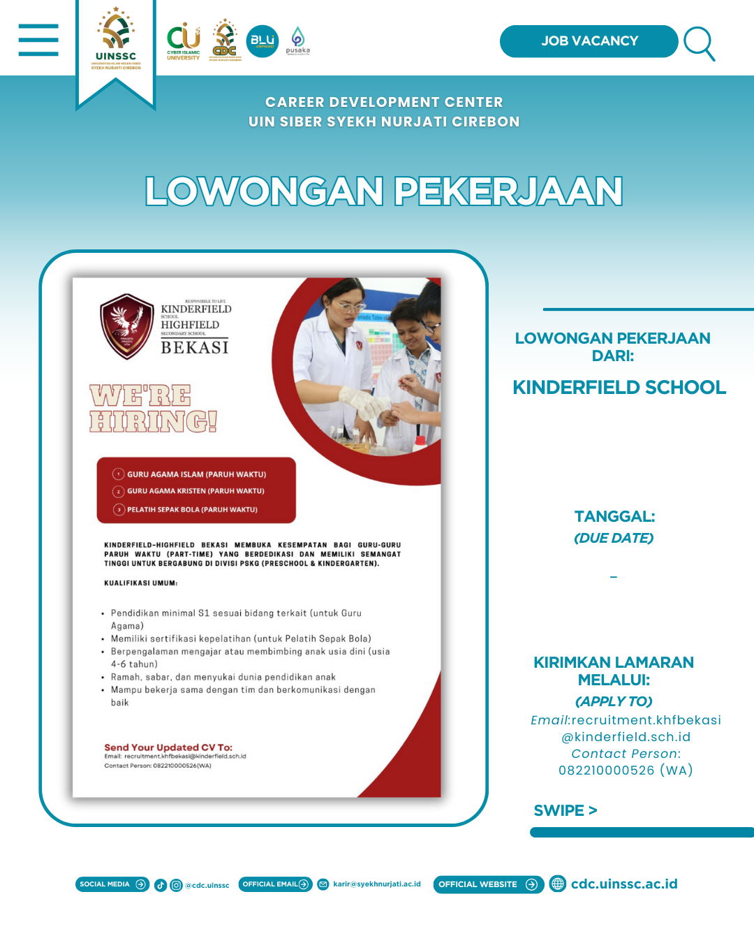 Kirimkan CV dan surat lamaran ke: recruitment.khfbekasi@kinderfield.sch.id